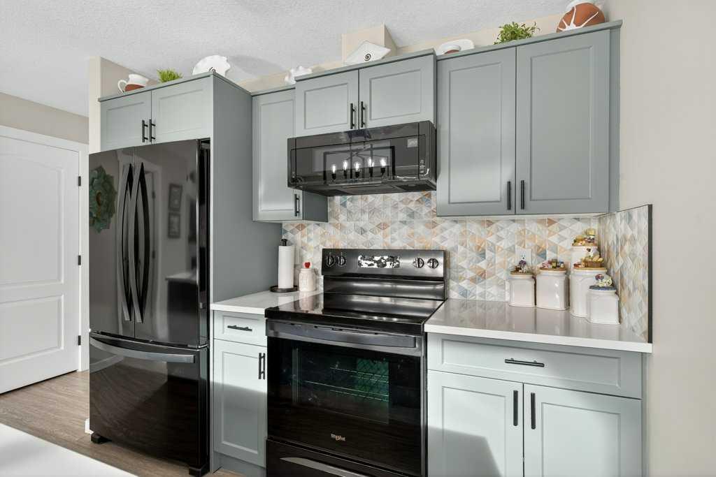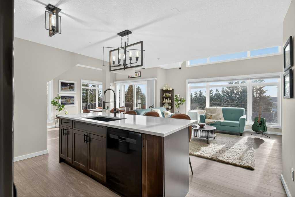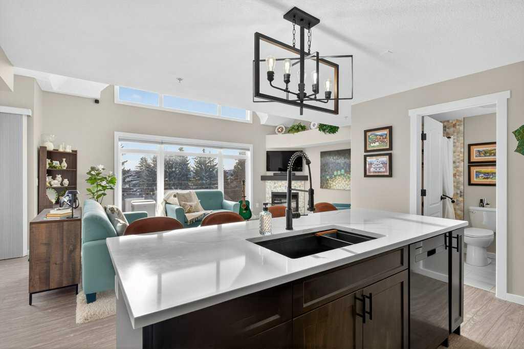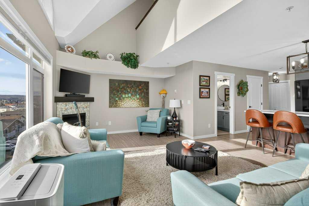 Experience exceptional condominium living in this incredible multi-level residence at 141 Mountain Street—one of the largest layouts in the entire building. Set in a quiet corner on the south side of the building, this unique unit comes with two titled parking stalls and offers an impressive level of privacy and natural light. Vaulted ceilings and massive windows draw your eyes to a view to Cochrane, while the expansive wrap-around balcony provides a relaxing spot to enjoy a hint of the mountains. The main level features a bright, open design that is perfect for both everyday living and entertaining. Fresh paint and meticulous upkeep make the space feel warm and welcoming. The well-appointed kitchen includes plentiful cabinetry, generous counter space, and a quartz island, ideal for prepping meals or gatherings with friends or family. A spacious dining area flows easily into the inviting living room, complete with a beautifully tiled gas fireplace. This level also includes a comfortable second bedroom, a 4-piece bathroom, and convenient in-suite laundry. Upstairs, the loft-style primary suite offers a peaceful escape with room for large furniture, a walk-through closet with exceptional storage, and a private 4-piece ensuite with dual quartz vanities. Recent upgrades include: New Kitchen cabinets, remodelled island, quartz counter-tops, all new appliances (incl. washer & dryer), new tile in foyer, kitchen backsplash, fireplace surround and both bathrooms (floors & tub/shower), fireplace mantle, paint (walls, doors, trim & ceiling), new sinks, faucets & toilets, light fixtures, custom blinds, new door hardware and even a custom built pantry. A unique advantage of this unit is dual elevator access—allowing you to reach your home from either the third or fourth floor. The heated parkade includes your two titled stalls, plus additional accessible and visitor parking for added convenience. Just steps from downtown Cochrane’s shops, restaurants, and amenities, this location also provides simple access to Calgary and the mountains via Crowchild Trail, Highway 1, and the nearby Tuscany C-Train station. MLS®: A2269892 - East End Apartment-Multi Level Unit $399,900